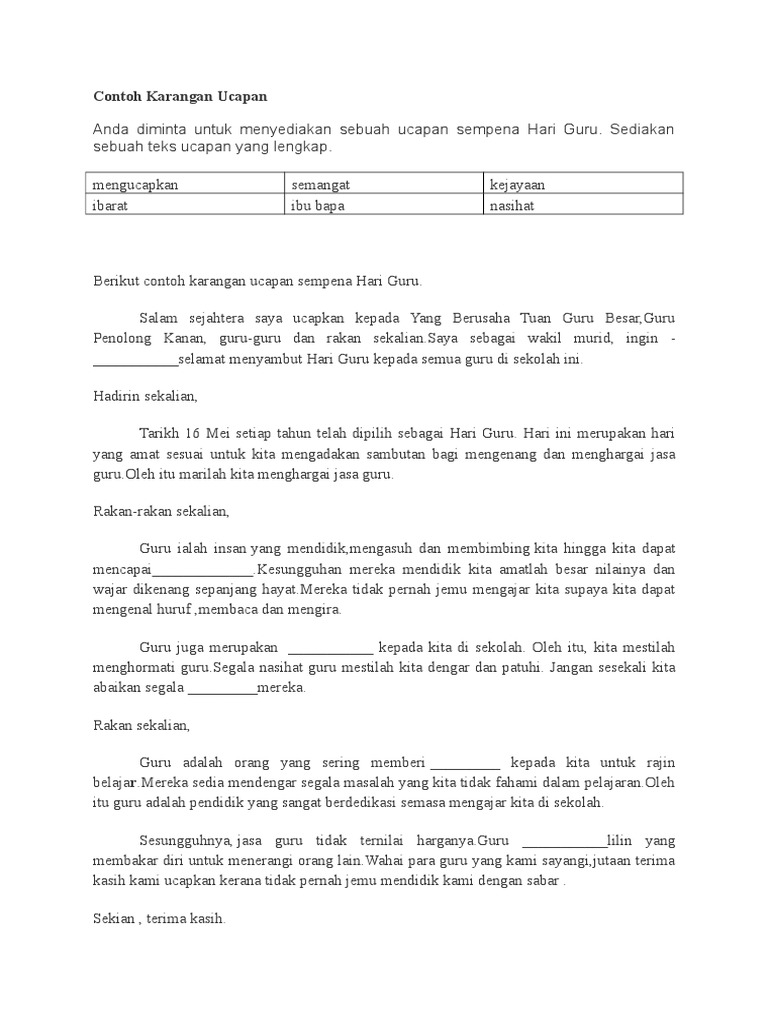 Contoh Karangan Ucapan Hari Guru Contoh Karangan Hari Guru Di Sekolah Saya Temukan Contoh 2 Ucapan Hari Guru Nasional Teert from tse1.mm.bing.net Tip menulis contoh karangan ucapan pt3. Mungkin kebanyakan pelajar akan mengetahui tentang hal ini. Download lagu contoh karangan syarahan pt3 mp3 dan mp4 video dengan kualitas terbaik. Karangan bahagian b karangan cemerlang kata orang jauh perjalanan, luas pemandangan. Dengan hormat, rasa syukur kami panjatkan atas terselenggaranya acara turnamen sepak bola kelurahan padang bulan. Contoh surat ucapan terimakasih kepada donatur. Tip menulis contoh karangan ucapan pt3. Informasi tentang contoh karangan, karangan adalah sebuah karya tulis yang berbentuk prosa naratif fiktif.