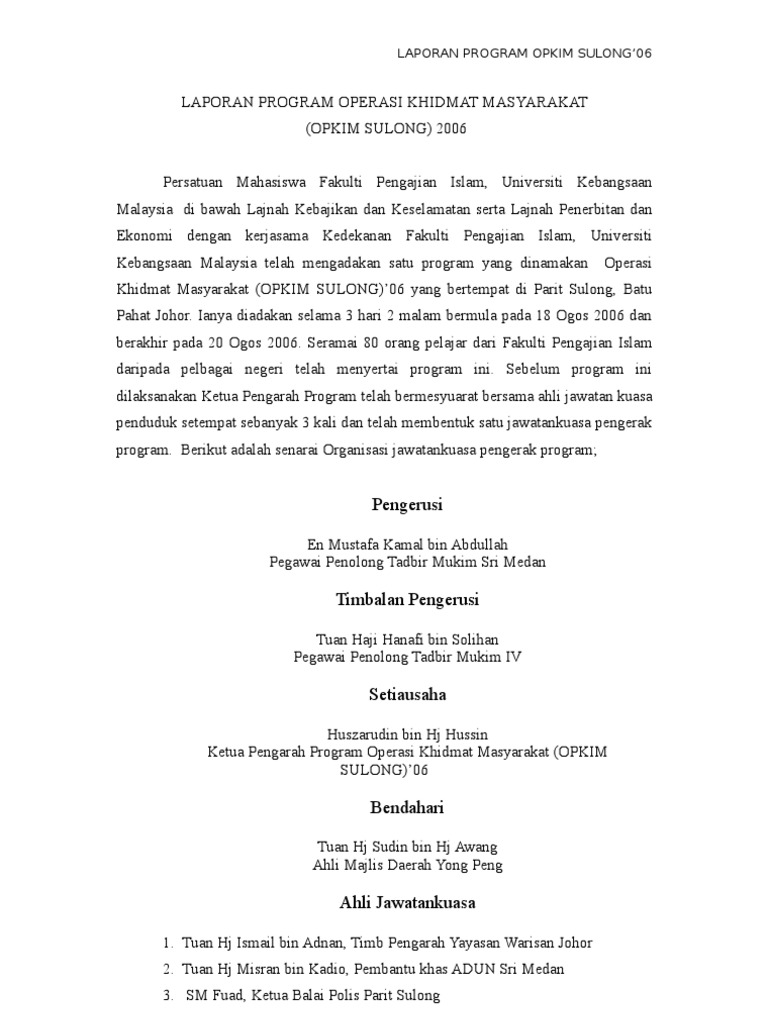 Kuliah kerja nyata program pengabdian masyarakat ( kkn ppm ) merupakan salah satu perwujudan dari tri dharma perguruan tinggi yaitu pengabdian masyarakat. Doc laporan aktiviti khidmat kemasyarakatan loges suresh academia edu. Contoh laporan bina insan guru tanah perkuburan. Gotong royong sempena minggu denggi patrol di kawasan sekolah. Contoh laporan pkl smk ap (administrasi perkantoran). Kertas kerja khidmat masyarakat sivik. Documents similar to contoh format laporan khidmat masyarakat. Huraikan konsep khidmat masyarakat berserta dengan contoh yang bersesuian. Program mengindahkan kawasan sekolah kk2. Program khidmat masyarakat gotong royong menghiasan tadika insan harapan. Laporan pelaksanaan kuliah kerja nyata (kkn) pos pemberdayaan masyarakat (posdaya) slaikers. Struktur program kurikulum, kalender pendidikan pada tahun ajaran tersebut akan disesuaikan dengan situasi dan kondisi meningkatkan aksesibilitas masyarakat terhadap energi, mineral dan informasi geologi. Kertas cadangan program khidmat masyarakat via www.scribd.com.