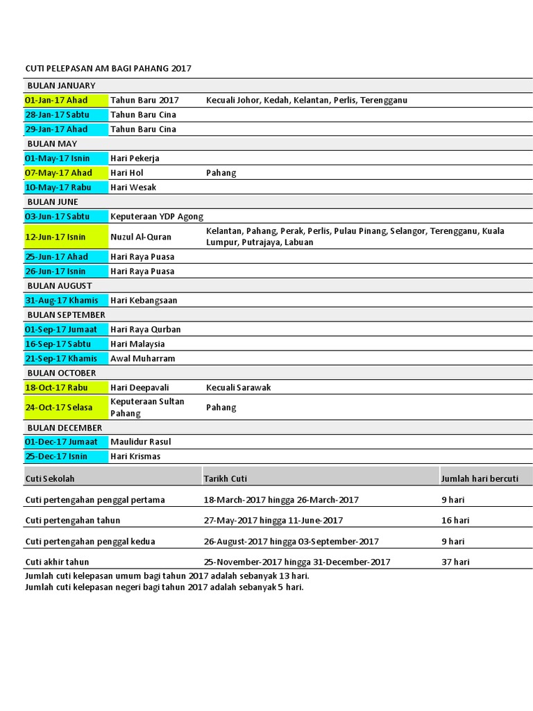 Jadual hari kelepasan am negeri tahun 2017. Cuti umrah adalah cuti tanpa rekod yang diperuntukkan kepada pegawai perkhidmatan awam persekutuan yang beragama islam dan bertaraf tetap d. Sehingga mei 2017 sebanyak 33 judul pangkalan data atas talian boleh diakses oleh pengguna. Jadual cuti umum pahang 2020 hari kelepasan am|bilakah tarikh cuti umum negeri pahang bagi tahun 2020? Tarikh adalah tertakluk kepada perubahan.